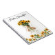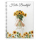 El arte de la portada de la libreta presenta un hermoso girasol en plena floración, con pétalos amarillos vibrantes que contrastan con el fondo blanco. Los detalles de las hojas verdes y el centro oscuro del girasol están meticulosamente representados, creando una sensación de realismo y belleza natural. La composición elegante y sencilla resalta la belleza y la delicadeza de esta flor icónica, perfecta para añadir un toque de alegría y frescura a tus notas diarias.