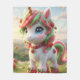 : Il s'agit d'une petite licorne blanche avec une crinière et une queue bicolores, mélangeant le rose fraise et le vert menthe. Sa chevelure est parsemée de petites fraises mûres, et elle porte un collier rouge orné d'un pendentif en forme de fraise.