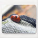 Een Lieveheerstbeestje dat op textiel weefsel zit met een groen aanslag en herfst kleuren op de achtergrond. Een close up van een stukje natuur waarin het rode kevertje met zwarte stippen prominent in beeld is. Het teken van geluk voorspoed en bescherming. Symbool tegen zinloos geweld en voor liefde.