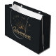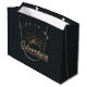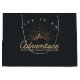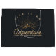 Stor presentväska med en illustration av färgaden guld på en svart grått-bakgrund. Designad med en illustration av ett berg där sol strålar lyser utåt. Typografin säger: Livet är en drömupptäckt i Äventyr.