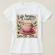 Life Begins with Coffee and Kindness captures the essence of a warm, welcoming morning. This design could feature a cozy coffee scene with a steaming cup, inviting latte art, and a delicate background with warm, earthy tones. A charming mug sits on a rustic wooden table, surrounded by gentle details like a small dish of coffee beans, a spoon, or even a simple flower or leaf for a touch of natural beauty. The quote "Life Begins with Coffee and Kindness" is displayed in soft, hand-lettered typography, emphasizing the positive, comforting vibe.