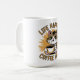 En charmerande illustration av en söt katt sitta upprätt, som håller ett varmt kopp kaffe med båda tassar. Katten har ett avslappnat uttryck, innehåll, som om den sparade ögonblicket, med ånga varsamt stigning från kopp. I bakgrunden finns det en mysigt kaféliknande ambians med mjuk, varm belysning. Uttrycket "Life Happens, Coffee Helps" visas på en framträdande plats i elegant, med ett lekfullt teckensnitt, med en perfekt blandning i scenen, vilket förstärker det komforterande budskapet. Bildens allmänna känsla är mysigt och lugnande, vilket fångar upp själva kärnan i en perfekt kaffebrytning.