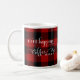 Roligt och snyggt röd och svart utcheckad Buffalo plaid mönster och kaffepunkten "Life Happens Coffee Helps" personlig mugg med attraktiv kaffebild på mitten med utrymme för din första behandling. Om du föredrar design utan mugg med monogrammet kan du radera den genom att välja att anpassa den ytterligare. Underbar Helgdag!
