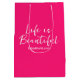 Förpacka dina gåvor i rosa inspiration! Denna eleganta 'Life is Beautiful' presentpapperspåse ger en modern och meningsfull touch till alla tillfällen, vackert visar din bloggprofil. Anpassningsbar rosa bakgrund för att matcha ditt varumärke