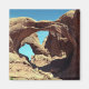 Det är en hett-augusti-dag i Arches National Park nära Moab, Utah. I det här fotografiet från färg samlas två enorma Entrada Sandstone ge i den mycket imponerande Dubblan Arch dess namn. Förgrundsbågen utgör en grov ovalöppning nära ram centrum. Sten-bildningen sträcker sig ut till den lämnat, i sol och till högerna, i skugga. Genom den andra grenen ner kurvor för att möta sten väggen i bakgrunden. Sandstenen för ljusa färgader visar många mörkar i skuggade delar. Förutom bågarna högdagrar tre ljussektioner blå himmel sandstenskonstruktionerna. 35 mm, fotografi av färg. Copyright ©Claire E. Skinner. Alla rättigheter förbehållna.