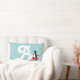 En penguin står med ett rött och vitt inre rör och stranden boll med ljusblå bakgrund. Den här söt animaliska tecknaden med monogram för personlig gör en söt och unik för barn för rörliga kuddar.