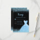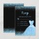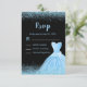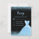 A beautiful light blue themed elegant watercolor dress gown on a black background with faux glitter at the top and bottom of the rsvp card.