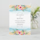 This watercolor design captures a serene coastal atmosphere with soft turquoise waves and sandy washes. Vibrant pink hibiscus and yellow plumeria flowers bloom alongside lush green monstera and palm foliage. The artistic palette evokes a warm, airy seaside destination feel, perfect for a romantic summer event by the ocean.