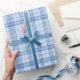 A soft and serene seamless plaid pattern featuring a light, powdery sky blue background. The grid is created by intersecting thin and medium lines of a deeper, true blue, giving it a delicate windowpane or gingham look. This tranquil textile design is ideal for projects requiring a subtle, clean, and calming aesthetic, such as nursery decor, shirting fabric, or minimalist digital backgrounds.
