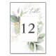 Pressa upp bröllop eller party bord med Bordsnumret Light Eucalyptus Glow & Guld.