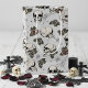 Handdragen i svart bläck, denna presentväska har ett vackert mönster av döskallar, ro och spindelnät i kräm och toner, allt mot elegantens ljusa grått bakgrund.