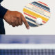 Det här är ett anpassade pingpongpaddel av beige, blue, red och gult rand.