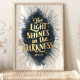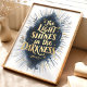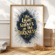 Upptäck ditt space med det kraftfulla meddelandet John 1:5. Den här eleganten har en utskrift med den inspirerande versen "Ljuset skiner i mörkret och mörkret har inte besegrat det" i ett vackert handskript, omgivet av en celestial vattenfärgsdesign. Perfekt för att lägga till lite tillit och hopp till din hemmadeeller på ditt kontor.