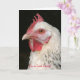Kycklingskort för en coola chick! Ett foto porträtt av en svart och vit lätt känslig kycklingras, med röd komb, mot svart bakgrund.