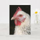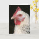 En porträtt av en svart och vit Light Sussex-kyckling med rött komb, med svart bakgrund, är insidan tom för hälsning eller som ett skydd.