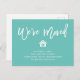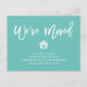 Den här moderna och trendiget nya adress flyttan har elegant, vit handskriven manustypografi som säger "vi har flyttat", på en färgstark, lätt tealbakgrund. Ett litet matchande hus dekorerar också framsidan, och det finns utrymme att lägga till ett meddelande på baksidan om du vill ha mer information om ditt nya hem. Ett enkelt och snyggt sätt att informera vänner och familj om att du har flyttat!