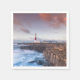 Hyrtorn England fyr på klipporna i England, med oceanen vågar som kraschar mot stränderna när havspiset spränger den lilla byn i havet. Den här vackra bilden av bild får dig att le.