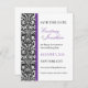 Ett svartvitt damast tapetmönster tillsammans med kungliga lila accenter tjänar till att framhäva denna inbjudan. Lätt att anpassa med ditt/dina namn, evenemangsdatoch information. Baksidan är medvetet lämnad tom. Finns i alternativa färger med matchande förmånstagare, vykort och inbjudningar