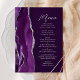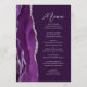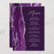 Den moderna bröllop-menyn i elegant har en lila vattenfärgsagat gräns som trimmas med faux silver glitter. Anpassadet kombinerar handskript för silver grått och sans serif typsnitt på plommonbakgrund. Lila och silver agate-konstruktionen upprepas på baksidan.
