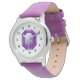 Monogrammad lila Amethyst gemstone logotyp Flickans klocka. Anpassningsbarna tittar på personligen med barnets namn eller första brev i monogrammet. Tidshållare för klockdesign för små flickors Födelsedagsfest. Gör en till dotter, barndotter, kusin osv.