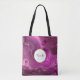En väska med en abstrakt elegant. Mörk lila ametyst färg med rosett band i guld som ligger mellan skiktade strata. Rik och vacker design. Överst är en vit cirkel ram med en faux guld-folie gräns, med personligens monogram initialt och namn inuti.