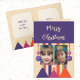 God jul hälsningskort. Lägg till dina två foton och ditt meddelande. Designad i olika färg - lila, rosa, orange, grönt med stjärnor och bubblor. Inuti lämnat - Med det bästa för nyårsperioden, eller byt text till kostym.