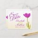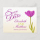Fin enkel lila-tulpaner på gräddskorpan färg sparar datumet för bröllop informella inbjudan. Redigera den här inbjudan med orden. Enkel modern och romantisk inbjudan, perfekt för en vår eller en tulpanblomma bröllop. Konstruktion och bra av vattenfärgstulpanfärgning av Sarah Trett.