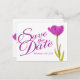 Vackra, ljusa lila-tulpaner på vit bakgrund sparar datumet för bröllop informella inbjudan. Anpassa den här inbjudan till din egen ord. Enkel modern och romantisk inbjudan, perfekt för lila, vår eller tulpanblomma bröllop. Konstruktion och bra av vattenfärgstulpanfärgning av Sarah Trett.