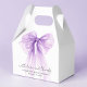 Eleganta bröllopsdusch-favoritpresentboxar med en lila coquettebåge i vattenfärg, "med kärlek och tack" presenterat i ett chic modernt typsnitt, och brudens namn och duschdatum i enkel bokstav.