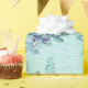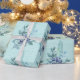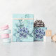 Lila bär och blå fjädrar på djup turkos presentpapper
