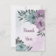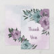 Unikt bröllop tack-kort med romantiska dammiga lila och blå blommor och gröna blad.