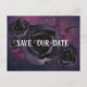 Vacker svart lila ro med lila blad dekorerar elegantens moderna gotiska Spara vårt datumkort. Baksidan är ett grått med vit traditionell text som läggs till med ett svart ro i mitten som ram på ditt foto. Gå in i ett område där Gothic inslag går in i jorden med modern estetik i vår Black Gothic bröllop Spara vår Date. Ett firande av kärlek och mörker väntar, där andar dansar under månljuset och kärlek inte känner några gränser.