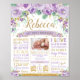 En perfekt detalj till din lilla flickas första födelsedagsfest! Denna vackra lila blommiga födelsedagsaffisch för första födelsedagen är perfekt att rama in och placera på en efterrätten/festdagsbord och sedan använda som dekoration i barnkammaren. Bra som fotopropp för mycket speciella och minnesvärda födelsedagsbilder! Det gör också en underbar unik present!