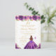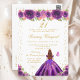Denna eleganta och glamourösa födelsedagsinbjudan presenterar en vacker prinsessa med brunrött hår och ljus hy i en mörklila klänning. Texten kombinerar handskriven skrift och moderna sans serif-teckensnitt för en klassisk och sofistikerad look. De blomsterarrangemang, fjärilar och guldconfetti skapar den perfekta blandningen av rustik och chic.
