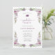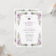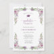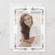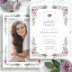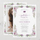 Lila Blommig Examenstillfällning. Fira din prestation med stil med denna eleganta examensfestinbjudan, perfekt för gymnasieelever och högskoleutexaminerade. Med en vacker rektangulär ram är denna inbjudan prydd med utsökta handmålade akvarellblommor i mjuk lavendel, rosafärgad, djup burgunderröd och livfull lila. Ömtåliga vilda blommor, rosor och elegant grönska ger en förfinad touch, medan en söt lila examensmössa ger en lekfull men sofistikerad detalj till designen. Elegant kalligrafiskrift förstärker det tidlösa utseendet, vilket gör den perfekt för vår- och sommarfiranden. Baksidan har ett koordinerande mönster tillsammans med utrymme för ett enda älskat foto, så att du