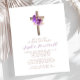 Denna eleganta dopinbjudan har en akvarellbukett av lila rosor och guldblad på ett enkelt träkors, ovanför orden "vänligen kom med oss till dopet av vår dotter" i brun kursiv stil. Personifiera den med hennes namn i delikat lila handskriven kalligrafi, med detaljerna i brun sans serif-teckensnitt på vit bakgrund. Perfekt för en flickas dop.