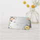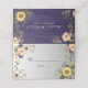 Elegant, modern, boho, botanisk, rustik trälila platskort för bröllop med namn och bordnummer, akvarellblommor, solrosor och grönska.