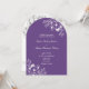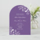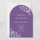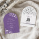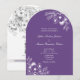 Denna eleganta välvda bröllopsinbjudan har en modern lila bakgrund i par med delikat vit blomsterlinjekonst och ett klassiskt serif-typografi. Designen inkluderar en komplett layout utan bilder på framsidan med era ceremonidetaljer, plus en matchande baksida med en QR-kod för RSVP och en länk till bröllopswebbplatsen för enkel gästaccess.