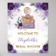 Resetematisk välkomstskylt för bröllopsfest, baby shower, bröllop. etc. med eleganta akvarell lila blommor, vintage resväskor och en vacker lila glob