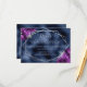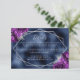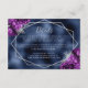 Detta eleganta moderna bröllop detaljer inklusionskort har en silver geometrisk ram dekorerad med lila blommor och silver falskt glitter på en marinblå falsk folie bakgrund. Den anpassningsbara texten kombinerar silvergrå whimiskt handskrift och kopparplåt typsnitt. Marinblå folie bilden upprepas på baksidan.