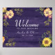 Rustik, elegant, modern, boho, lila wood bröllop välkommen poster med vattenfärgade blommor och grönska.