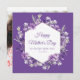 En bildkortsdesign för blommigten med vattenfärg och lila blommor och svart skript. Texten och färg kan vara personlig.