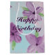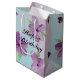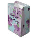 papper presentväska i lila med medelhög lila med vattenfärgsutskrift i blommigt, accentuerad med lila hjärtan och blått. Texten från grattis på födelsedagen kan vara personlig till kostym i alla speciella firande, inklusive bröllop, eller en speciell årsdag eller företagsevenemang. Text kan också tas bort.