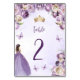 De vackra quinceañera-bordsnumren har en gräns av lila- och elfenbensblommor i blekens lila vattenfärgsbakgrund. Guld tiara, en mörk-ordförande i en lila prinsessa-klänning och små lila-fjärilar dekorerar texten. Ord "bord" och talet visas i handskriftsskript för lila.