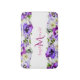 Två eleganters gräns av violett, lavendelfärgad färgad, lila och vita blommor, pansier i en genomskinlig bakgrund. Mallar för ett monogram brev och namn eller namn, rosa och lila färgad brev.