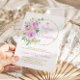 Lila blommor baby första födelsedagsinbjudan med grönt eukalyptus löv & lila vattencolor ro och guldkrans