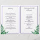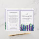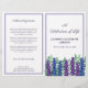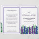 Blommigtens begravningsprogram i vitt med mörk lila typsnitt, grön, blå och lila blommor. På baksidan kan du skriva obituarien och programmet. Fäst det själv för ett praktiskt program.