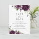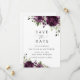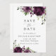 Vänner och familj i inbjudan i stil och ange tonen för din speciella dag med den här charmen spara datumkortet. Utformningen har blommor med vattenfärg från plommon lila och grönt mot vit bakgrund.