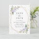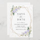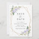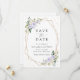 Vänner och familj i inbjudan i stil och ange tonen för din speciella dag med den här charmen spara datumkortet. Utformningen har lila- och vitvattenblommor, grönt, guld konetti och guld ram på vit bakgrund.