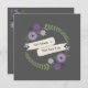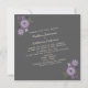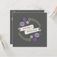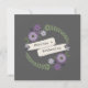 En bröllopsinbjudan med en illustration av lila blommor och grönska arrangerade i en cirkel med banderoll i mitten. Personifiera med namn. Baksidan har blommor högst upp till vänster och längst ner till höger. Anpassa texten med detaljer om ditt evenemang. Bakgrunden är grå. Formuleringen är från brud och brudgum tillsammans med deras familjer.